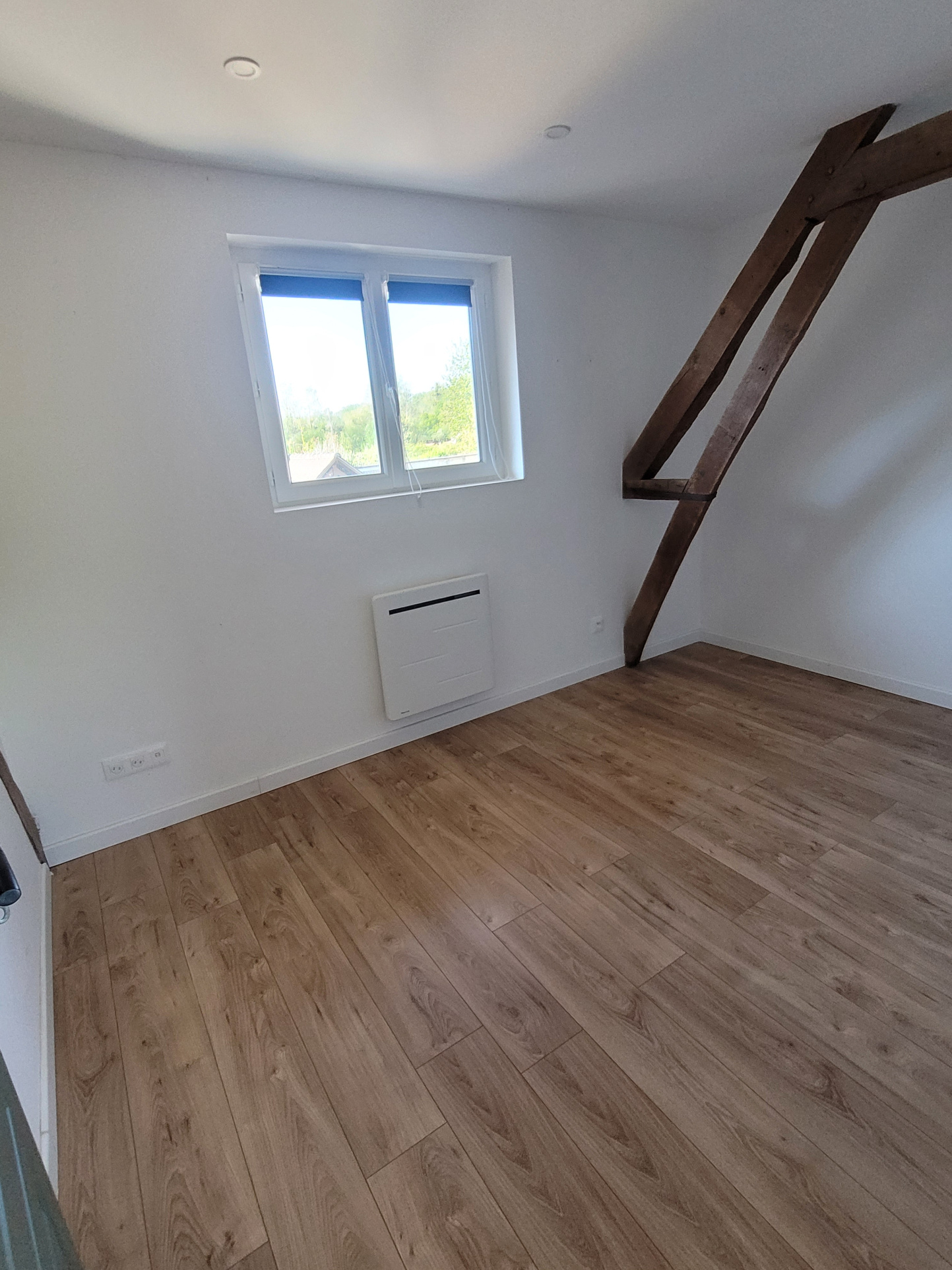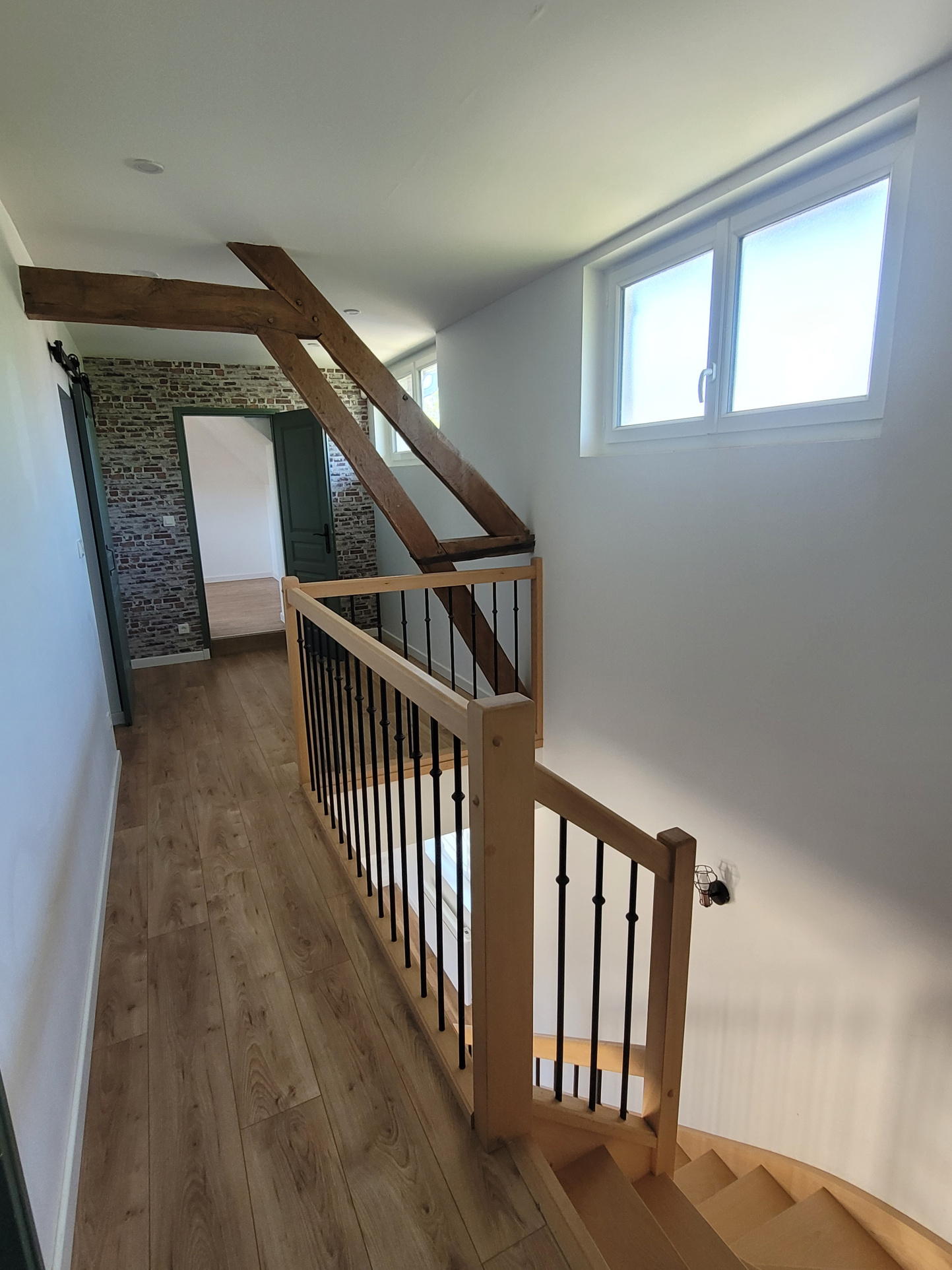 L'étage propose un palier authentique avec poutres apparentes qui dessert 3 chambres dont une suite parentale avec sa propre salle d'eau ainsi qu'une seconde salle d'eau avec wc.