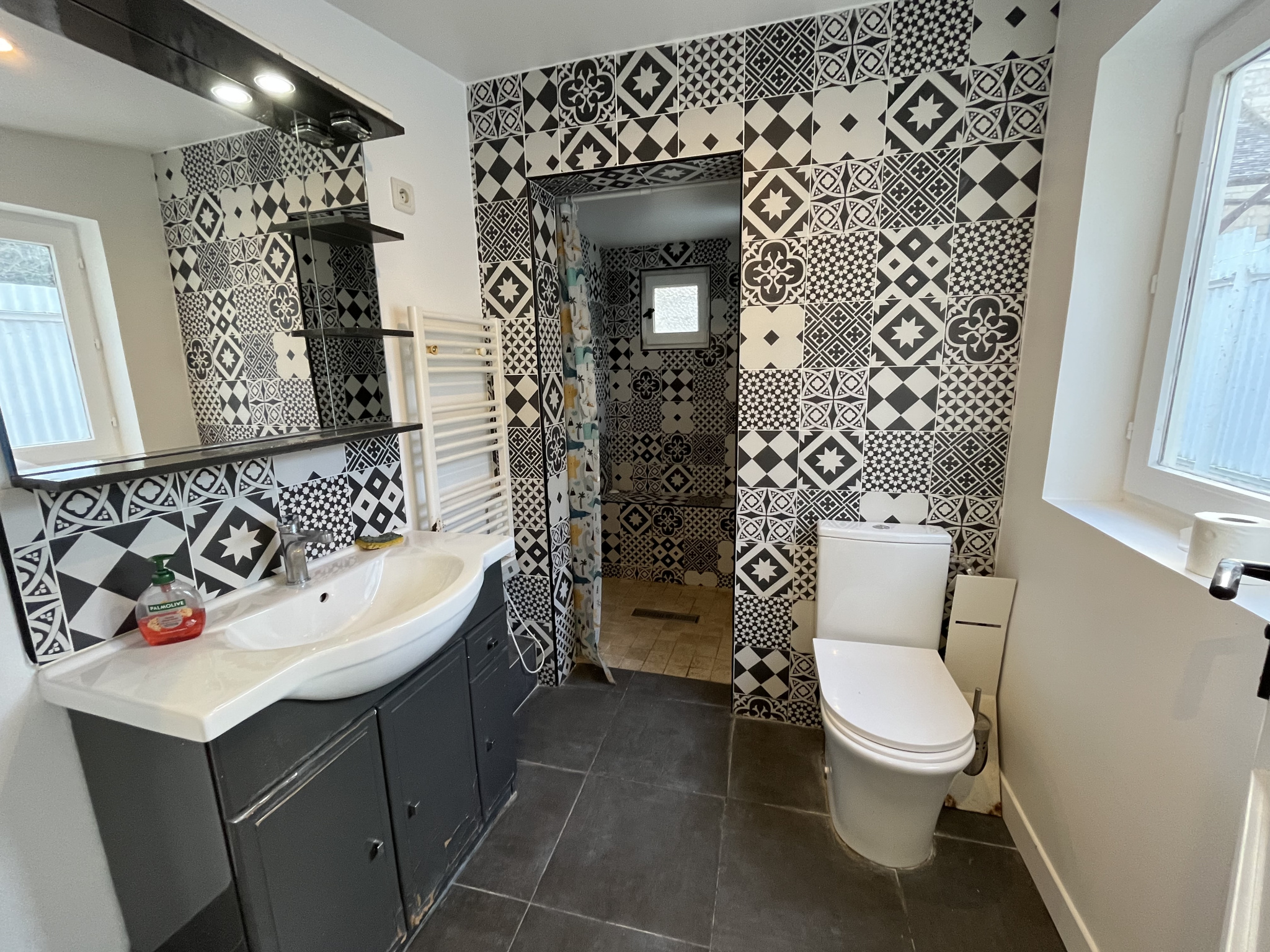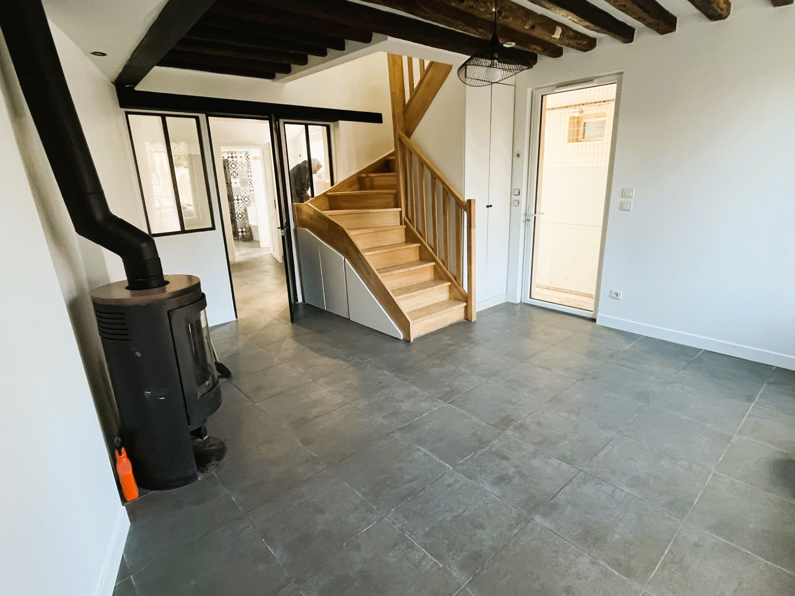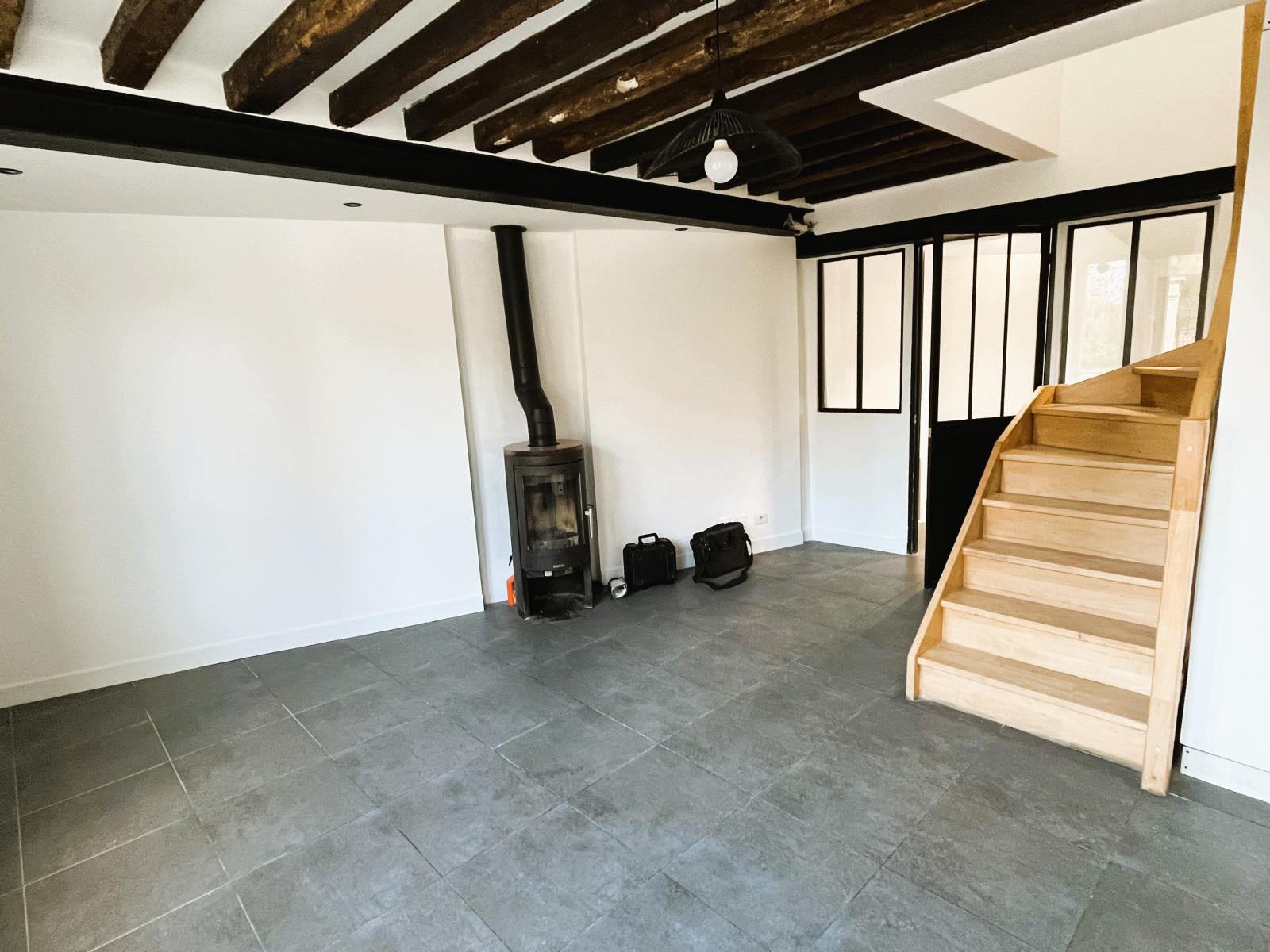 La maison vous offre un agréable séjour avec poêle à bois, cuisine attenante, salle d'eau avec douche et WC.