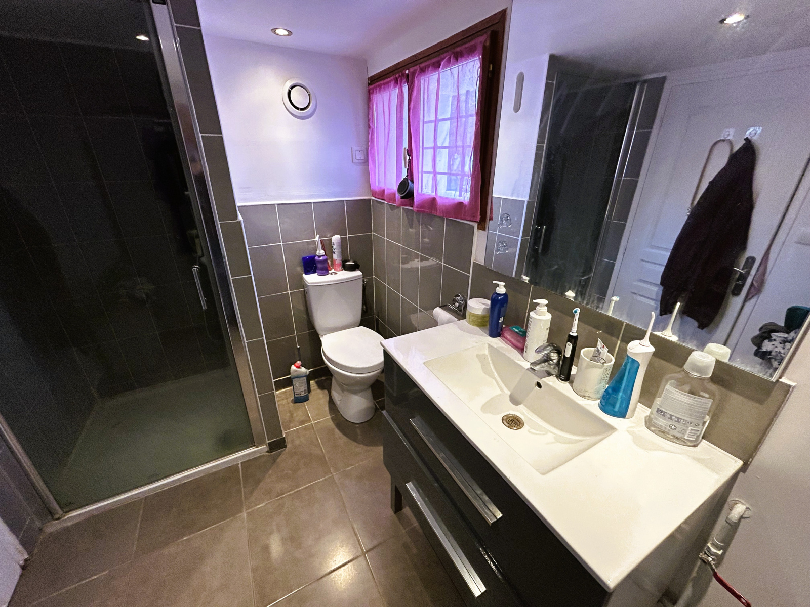 Au 1er étage, la seconde entrée dessert un WC indépendant, une cuisine séparée aménagée, une salle à manger, un salon avec un poële à granulé, une salle d'eau et deux chambres.