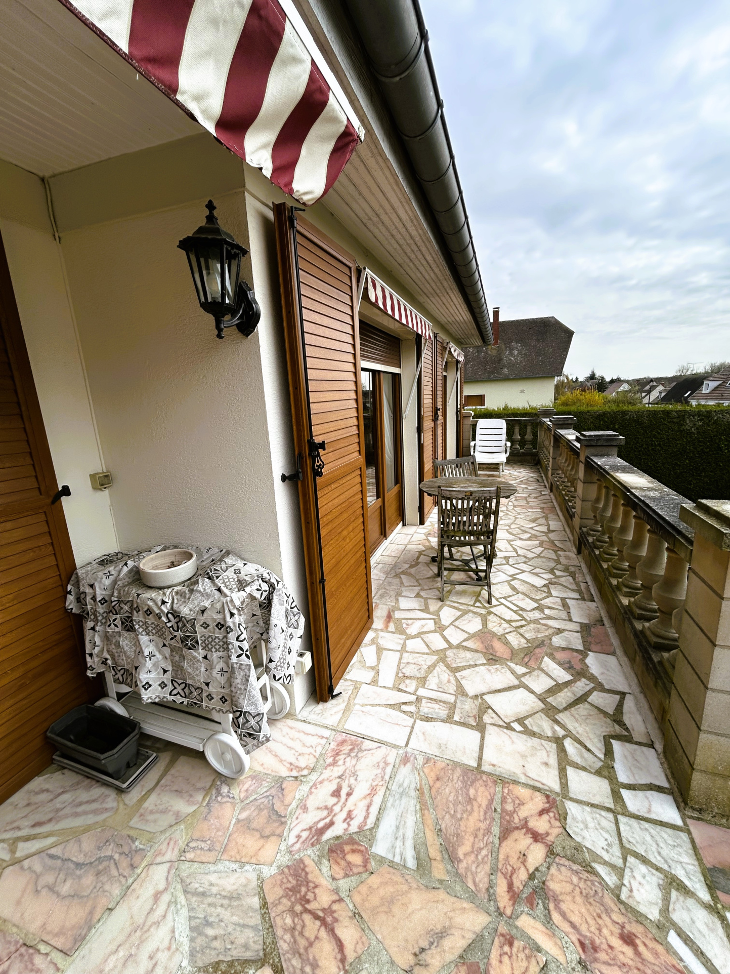 Double vitrage PVC, volets roulants électrique PVC pour la facilité et volets battants PVC et toit 4 pans en petites tuiles pour le style.