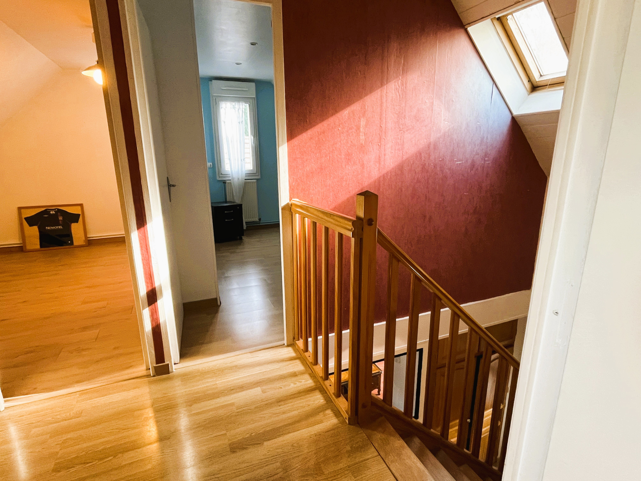 A l'étage palier desservant trois chambres dont une avec salle d'eau, wc. chauffage central au gaz de ville .garage et dépendances.